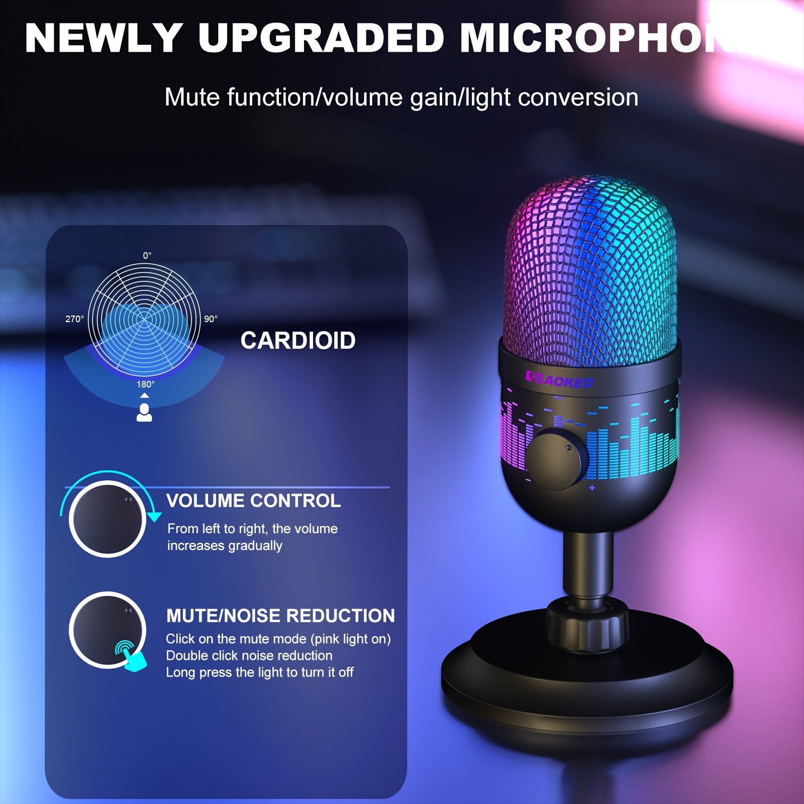 AOKEO Premium USB Gaming Microphone - Ideal for Live Streaming, Podcasting & Recording | Compatible with Mac/PS4/PS5 | RGB Lighting, One-Click Mute, Noise Reduction, Headphone Jack