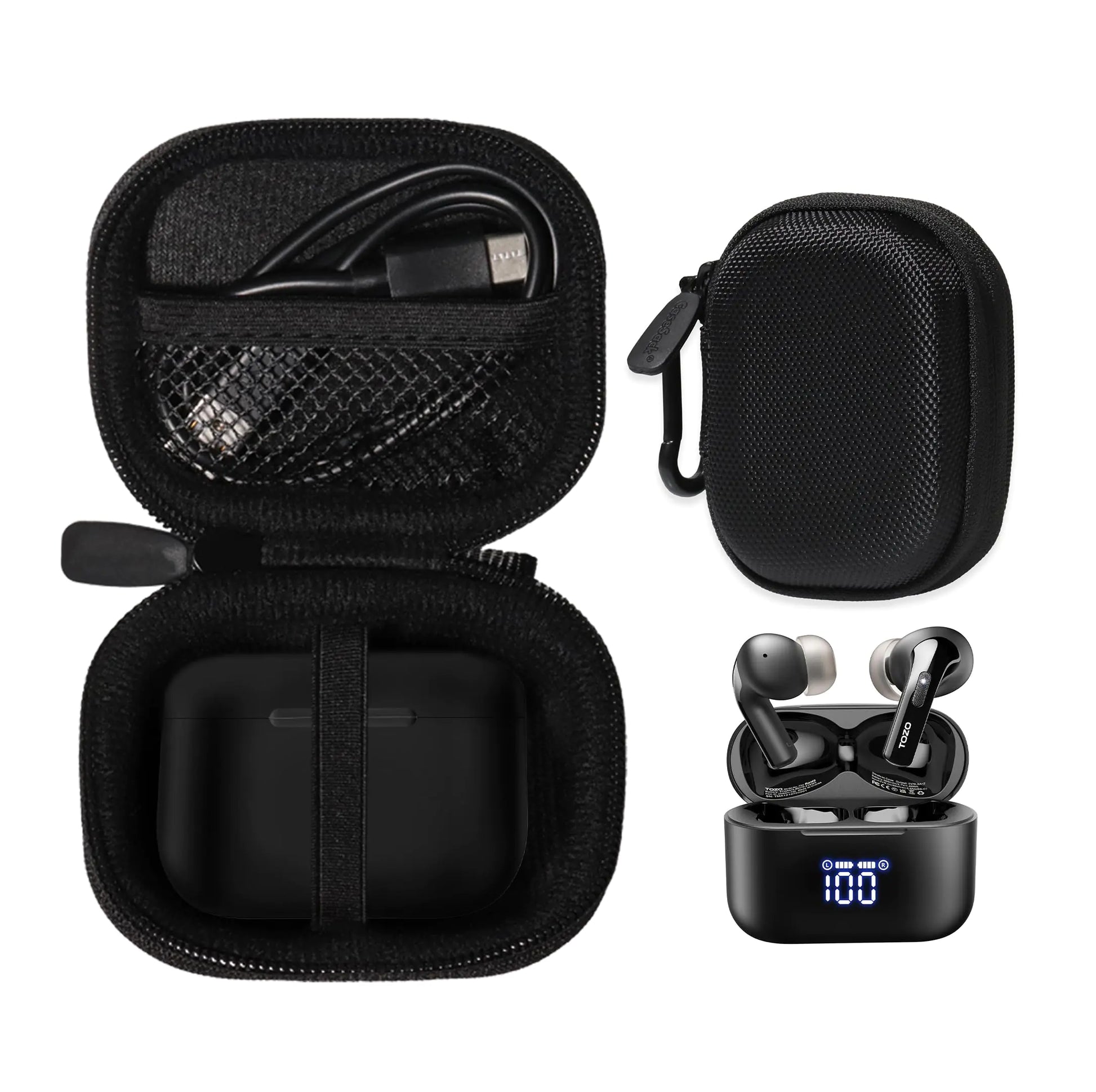 Protective case for TOZO T20 EarbudsFeature design fashion handy case with compact and light weight featurewith elastic strap to secure earbuds and mesh pocket for charge cord and other accessoriesBetter organizing and protecting case for easy carryingShockproof Case with soft lining interior The antistatic shock absorbing protection against minor bumps etc.Strong Semi-hard zipper case giving best solution for Carrying and Storage protectionNote: zipper case only device for illustration only